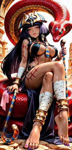 ,DETAILED, INTRICATE, SOFT SHADING,DETAILED TEXTURES,hyper detailed, (dynamic pose:1.4),pharaohmge,,Long hair, straight hair,large headdress,egyptian clothes,,horizontal-striped breasts,, purple nails,anklet,holding scepter, arm tattoo,,sitting on snake,, coiled,