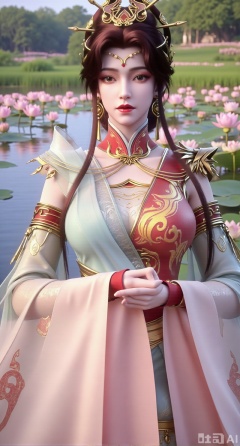 (masterpiece, best quality:1.2),1girl, navel, solo, midriff, bare shoulders, hair ornament,(long hair),(High double ponytail:1.49), red lips, BREAK, (looking at viewer:1.39), chinese clothes,(Holographic pink|green dress:1.36), (lace,Rainbow Gradient Color:1.28), BREAK,blurry, solo focus, long hair, lips, daytime, lipstick, outdoors, standing,upper body,(huge breasts:2.89), background, solo, makeup,(Liquid glass style flowers:1.49),(huge breasts:2.99),(full breasts:2.99),,(Background with lotus pond and pink lotus flowers:1.39),,Xfengmian2,Xzhenxianyingling,XhenrendadiX,Xzhenxianyingling2,XhenrennvdiX