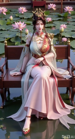 (masterpiece:1.2),best quality,The image is a digital illustration of a young woman sitting on a wooden bench in a pond with lily pads. She is wearing a long dress with design on the chest and sleeves. The dress has a high neckline and short sleeves,Holding a lotus in hand. She has long dark hair styled in loose waves and is wearing gold high heels. The woman is posing with one hand on her hip and the other resting on the edge of the bench. The background is filled with pink and white lotus flowers and green leaves. The overall mood of the image is peaceful and serene,(huge breasts:2.99),(full breasts:2.99),(Background with traditional Chinese architecture, lotus pond and pink lotus flowers:1.39),Xfengmian2,Xzhenxianyingling,XhenrendadiX,Xzhenxianyingling2,XhenrennvdiX
