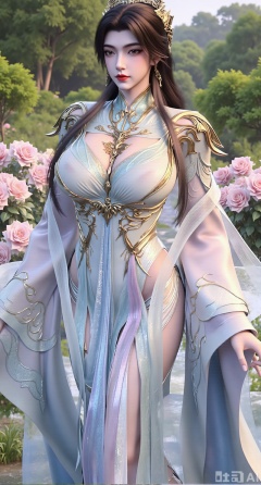 (masterpiece:1.2),best quality,,A woman adorned in traditional Chinese attire,featuring a flowing robe with intricate embroidery and floral accents. A garden filled with pink roses and lush greenery. Soft pastel hues of white,blue,and green,creating a serene atmosphere. Photorealistic photography.,,(huge breasts:2.99),(full breasts:2.99),Xzhenxianyingling2,XhenrennvdiX,Xzhenxianyingling,XhenrendadiX