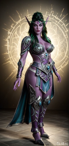masterpiece, best quality, amazing quality, absurdres, soft, 1girl, 20yo, solo, full body, blush, looking at viewer, detailed background, cinematic, volumetric lighting, dynamic shadows,per detailed, (dynamic pose:1.4),NIGHTELFWOW,COLOURED PURPLE SKIN,,GREEN HAIR,hold a weapon bow. aim to viewer.