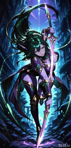 masterpiece, best quality, amazing quality, absurdres, soft, 1girl, 20yo, solo, full body, blush, looking at viewer, detailed background, cinematic, volumetric lighting, dynamic shadows,per detailed, (dynamic pose:1.4),NIGHTELFWOW,COLOURED PURPLE SKIN,,GREEN HAIR,hold a weapon bow. aim to viewer.