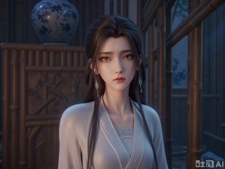 The image depicts a young woman with long, flowing hair, wearing traditional attire that includes intricate embroidery and delicate jewelry. She is standing in what appears to be a serene, possibly East Asian, setting, with a large blue and white porcelain vase in the background and bamboo structures framing the scene. The lighting is soft and ambient, giving the image a calm and contemplative atmosphere.