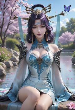 score_9,score_8_up,score_7_up,1girl,solo,realistic,(looking at viewer:1.1),portrait,1girl,solo,realistic,dress,white dress,chinese clothes,blue dress,wide sleeves,long sleeves,shoulder armor,ribbon,detached sleeves,clothing cutout,armor,shoulder cutout,detached collar,black gloves,1girl,solo,realistic,jewelry,tiara,hair ornament,hair rings,beads,forehead jewel,forehead mark,facial mark,hair stick,earrings,tassel,tassel earrings,bracelet,1girl,solo,realistic,(mature face:1.2),big eye,(pale_skin:1.1),(shiny_skin:1.1),slender face,hair bun,long hair,black hair,purple hair,purple eyes,purple lips,parted bangs,braid,makeup,eyeshadow,bare shoulders,closed mouth,realistic,purple background,in spring,available light,lake,calm water,flower,(falling petals:1.3),(flower sea:1.2),butterfly,glowing butterfly,medium breasts,(cleavage:1.1),cleavage cutout,<lora:小巳-红粉骷髅-凭依身:0.85>,
