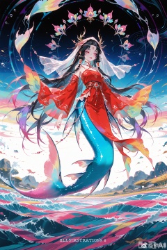 extremely detailed CG unity 8k wallpaper,extremely detailed,High Detail,vibrant colors,absolutely eye-catching,ambient occlusion,raytracing,best quality,amazing quality,very aesthetic,absurdres,available light,Cinematic Lighting,depth of field,newest,1girl,monster girl,mermaid, mermaid,fins,jiayi_clothes, red jiayi_clothes, head veil,long veil,uxurious and gorgeous,in the dark,hair tubes,black long hair,very long hair,night,