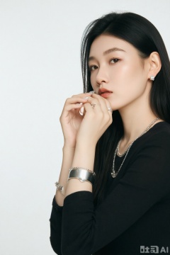 A girl , adorned with silver jewelry, places her hands near her mouth against a pure white background. The composition is close - up, the tone is clean and simple, the light is even, and the style is minimalist and elegant.qxsn