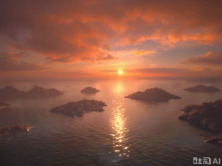 The image depicts a serene seascape at sunset. The sky is filled with dramatic clouds, illuminated in shades of orange, pink, and gold, reflecting the setting sun. The water below is calm, with gentle ripples catching the last rays of sunlight. Small islands or rock formations are visible in the distance, partially obscured by the water. The overall atmosphere is peaceful and picturesque, capturing the beauty of nature at dusk.,