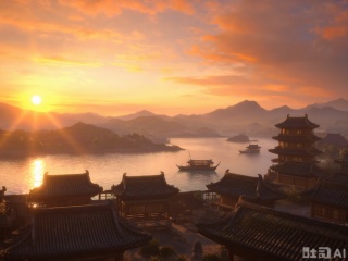 In the background, there is a vast expanse of water, likely a river or a bay, with several boats floating on it. The water reflects the warm hues of the setting sun, creating a tranquil and harmonious atmosphere. Beyond the water, there are rolling hills and mountains, shrouded in a light mist, adding depth and a sense of mystery to the scene. The sky is painted with vibrant shades of orange, yellow, and pink, indicating the sun is either rising or setting, casting a soft and warm glow over the entire landscape. The overall composition is peaceful and evokes a sense of timelessness and beauty.
