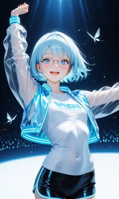 sharp focus, smile, open mouth, ultra detailed lips, ultra detailed face and hair,kawaii, adorable, cute,(theme is A cyberspace in future), (background is A cyberspace where countless light and light particles fly around)headshot, loving smile, dancing, spread arm,(she is wearing a sheer, transparent, neon blue and white futuristic sparkling cyber jacket and cyber digital t-shirt and extreme low-rise cyber shorts),cyber girl, (light blue hair), short cut hair, slim body, healthy body, clear blue eyes, glasses,BREAK, volumetric lighting, copi-chan, (light blue hair), short cut hair, slim body, healthy body, clear blue eyes, glasses,, masterpiece, amazing quality, very aesthetic, high resolution, ultra-detailed, absolute, newest,2d, semi-realistic, moe heroine, sharp focus,, anime style, anime color, anime artwork, anime, cel anime, flat color,