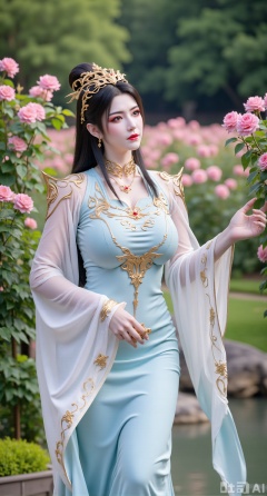 sfw,(masterpiece:1.2),best quality,,A woman adorned in traditional Chinese attire,featuring a flowing robe with intricate embroidery and floral accents. A garden filled with pink roses and lush greenery. Soft pastel hues of white,blue,and green,creating a serene atmosphere. Photorealistic photography.,,(huge breasts:2.99),(full breasts:2.99),Xbaozhiyinhuaqun,Xlonger,Xxiaoli,Xtangheziqun,Xyunyunshouban,XgangshouCOS,Xgangshou,XQueenMedusa
