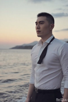 xnz,wjc, A man in a white shirt, black tie and pants, pectorals,stands by the sea, with dusk sea view and distant mountains. Panoramic composition, cool tones, soft light, literary and lonely. Background: sea, sky, distant mountains.