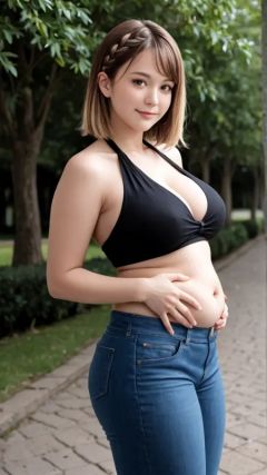 1girl, large breasts, plump,( fat folds:1.5), medium hair, brown hair, blonde highlights \(coloring\), braided bangs, halter top, sleeveless, bare shoulders, midriff, blue lowleg pants, park, grabbing own stomach, seductive smile,, masterpiece, ultra-HD, photorealistic, high detail, best quality, 8k, best quality, sharp focus, ray-tracing, realistic, depth of field, shallow depth of field, raw photo.