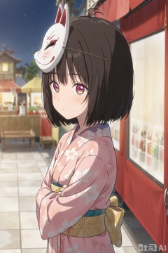 1girl,solo,short hair,bangs,brown hair,black hair,closed mouth,ahoge,indoors,frown,bob cut,antenna hair,,upper body,,,masterpiece,best quality,official art,extremely detailed CG unity 8k wallpaper,Window,Sunshine,Long sleeves,slender waist,(slim:1.3),from above,arms_crossed,tear,,(blush:1.3),pink kimono,fox mask,mask on head,japanese clothes,,outdoors,market,night,(profile:0.6)