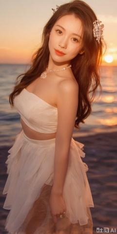 best quality, masterpiece, realistic,cowboy_shot,(Good structure), DSLR Quality,Depth of field,kind smile,looking_at_viewer,Dynamic pose, 1girl, solo, long hair, , looking at viewer, skirt, hair ornament, bare shoulders, jewelry, , earrings, outdoors, midriff, water, necklace, lips, crop top, leaning forward, ocean, white skirt, strapless vest, sunset, sun,meinvzi
