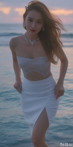 best quality, masterpiece, realistic,cowboy_shot,(Good structure), DSLR Quality,Depth of field,kind smile,looking_at_viewer,Dynamic pose, 1girl, solo, long hair, , looking at viewer, skirt, hair ornament, bare shoulders, jewelry, , earrings, outdoors, midriff, water, necklace, lips, crop top, leaning forward, ocean, white skirt, strapless vest, sunset, sun,meinvzi