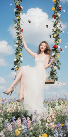 Surreal warm cinematic full body shot photography,Kodak Professional Portra 160,1girl,looking_at_viewer,navel,exquisite diamond-encrusted high heels,kind smile,super long legs,realistic,pose for picture,Dynamic posture, The sky is like a piece of blue crystal that has been washed very clean. The large white cloud floats lazily, with the edges of sunshine golden edges. Occasionally, a breeze blows by, and the shadows of clouds flow slowly among the sea of flowers. The girl sat on the swing, her long hair hanging like a waterfall, her hair ends were naturally curly, and a few strands of hair were blown to her cheeks by the wind, and gently wrapped with the petals hanging on the swing rope. There seems to be fine amethyst hidden between the hair, refracting hazy light in the sun. Occasionally, butterflies stop between the hair, and when their wings flap, they complement the hair. The eyes are clearer than the deepest cornflower, with long eyelashes and trembling gently like butterfly wings. When looking into the distance, the eyes seem to be filled with the blue of the sky and the white of the clouds. She was wearing a long white dress, with the hem of the skirt hanging on the edge of the swing seat, and gently raised as the swing swayed, like a blooming white rose, with a few small petals at the corner of the skirt, which was a gift brought by the wind from the sea of flowers. The rope of the swing is wrapped in dense vines, and the shiny green vines are decorated with colorful flowers - crimson roses, goose yellow foreboding, light pink lily of the valley, light purple forget-me-not, and even a few blue-purple grape hyacinths. The flowers are layered, turning the rope into two blooming ribbons. The vines climbed up the rope, some wrapped around the edge of the seat, and some fell down, just brushing across the girl's skirt. Around her was a sea of flowers that could not be seen at the edge of the boundless flowers, with flowers of various colors crowding together, spreading from under her feet to the horizon, connecting with the blue sky and white clouds. When the swing sways gently, the petals on the vines fall down, some float into the girl's hair, some fall on her skirt, and some fall into the sea of flowers in a spiral, stirring up a slight fragrance. She raised her head slightly, and the sunlight fell on her face through the gaps of the petals. Her skin exuded a delicate luster, forming a very beautiful picture with her hair, eyes, and white skirt, as if an elf walking out of her dream. The whole world was dyed with a halo of fantasy beauty because of her.,