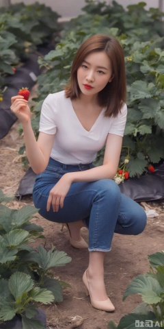 The image shows a young woman crouching in a lush garden filled with strawberry plants. She is wearing a white short-sleeved shirt and blue jeans, along with beige high-heeled shoes. She is holding a ripe strawberry in her right hand, which is raised to her face, and her left hand rests on her knee. The background consists of rows of strawberry plants, and the setting appears to be a greenhouse or a similar structure, as indicated by the blurred, translucent plants and the overall bright and natural lighting. The woman is positioned centrally in the image, with the plants surrounding her. The image has a soft, slightly artistic quality, with a focus on the woman and the vibrant strawberries.meinvzi