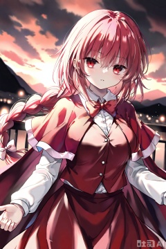 masterpiece,illustration,ultra detailed,hdr,Depth of field,standing,looking_at_viewer,okazaki yumemi,1girl,red capelet,solo,red bowtie,red vest,red skirt,long sleeves,white shirt,ribbon,long braid,single braid,white sleeves,red hair,red eyes,red cape,white collared shirt,long skirt