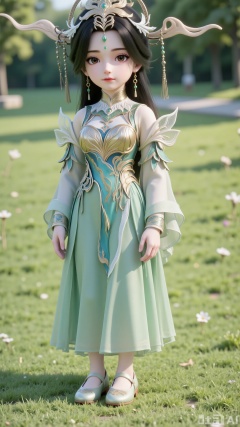 A little girl stands on the lawn, facing the audience. She has long black hair, and this is a frontal shot. She is small in stature, wearing hair accessories and a crown. She is dressed in a green gradient dress with gold and blue stripe decorations, featuring a wide-sleeve design and matching sleeve covers. There is a mark and a forehead ornament on her forehead. The lower part of the dress is a tulle skirt with a transparent texture, and the cuffs are detachable. The costume is adorned with exquisite embroidery, and she also wears earrings and a necklace. She has sky-blue eyes and is wearing light-colored flat embroidered shoes, standing on the ground with her hands hanging down. It is an outdoor setting with wildflowers, trees, and a park. There are light and shadow effects, filled with natural light.