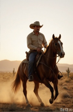 A male cowboy wearing a wide-brimmed hat rode a horse and galloped across the vast western wilderness. The sunset lengthened his silhouette, the horse's hooves raised dust, and in the distance were continuous mountains and cactus. He had a revolver on his waist, his expression was cold and free, and the whole picture was full of rough and romantic western style.