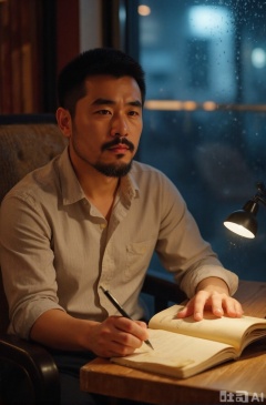 A young man with stubble sat in the corner of a late-night cafe, with a pen hanging from a yellowed notebook, and the ink blew into unfinished poems. Neon lights flashed outside the window, raindrops made hazy light marks on the glass, his side face was plated with amber by a warm desk lamp, and his eyes wandered at the boundary between reality and fantasy.