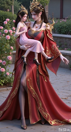 (masterpiece:1.2),best quality,,A woman ,(red|gold|black long dress). black Stockings, high heels,Holding a 6-year-old girl in her arms,,featuring a flowing robe with intricate embroidery and floral accents. A garden filled with pink roses and lush greenery. Soft pastel hues of white,blue,and green,creating a serene atmosphere. Photorealistic photography.,,(huge breasts:2.99),(full breasts:2.99),Xfengmian2,Xzhenxianyingling,XhenrendadiX,Xzhenxianyingling2,XhenrennvdiX,XgangshouCOS,Xgangshou,XMedusaQueen