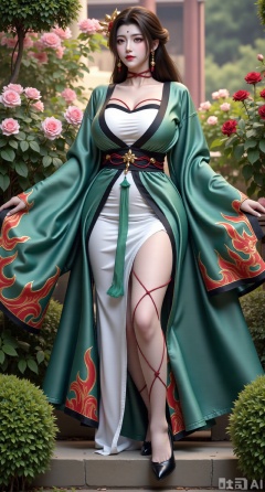 (masterpiece:1.2),best quality,,A woman ,(green|white|black dress). black Stockings, high heels,,featuring a flowing robe with intricate embroidery and floral accents. A garden filled with pink roses and lush greenery. Soft pastel hues of white,blue,and green,creating a serene atmosphere. Photorealistic photography.,,(huge breasts:2.99),(full breasts:2.99),Xfengmian2,Xzhenxianyingling,XhenrendadiX,Xzhenxianyingling2,XhenrennvdiX,XgangshouCOS,Xgangshou,XMedusaQueen
