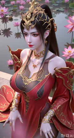 (masterpiece, best quality:1.2),1girl, navel, solo, midriff, bare shoulders, hair ornament,(long hair),(High double ponytail:1.49), red lips, BREAK, (looking at viewer:1.39), chinese clothes,(Holographic red|gold|black dress:1.36), (lace,Rainbow Gradient Color:1.28), BREAK,blurry, solo focus, long hair, lips, daytime, lipstick, outdoors, standing,upper body,(huge breasts:2.89), background, solo, makeup,(Liquid glass style flowers:1.49),(huge breasts:2.99),(full breasts:2.99),,(Background with lotus pond and pink lotus flowers:1.39),,,Xfengmian2,Xzhenxianyingling,XhenrendadiX,Xzhenxianyingling2,XhenrennvdiX,XgangshouCOS,Xgangshou,XMedusaQueen
