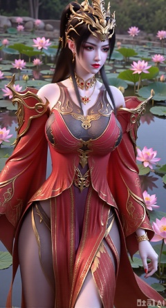 (masterpiece, best quality:1.2),1girl, navel, solo, midriff, bare shoulders, hair ornament,(long hair),(High double ponytail:1.49), red lips, BREAK, (looking at viewer:1.39), chinese clothes,(Holographic red|gold|black dress:1.36), (lace,Rainbow Gradient Color:1.28), BREAK,blurry, solo focus, long hair, lips, daytime, lipstick, outdoors, standing,upper body,(huge breasts:2.89), background, solo, makeup,(Liquid glass style flowers:1.49),(huge breasts:2.99),(full breasts:2.99),,(Background with lotus pond and pink lotus flowers:1.39),,,Xfengmian2,Xzhenxianyingling,XhenrendadiX,Xzhenxianyingling2,XhenrennvdiX,XgangshouCOS,Xgangshou,XMedusaQueen
