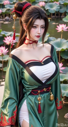 (masterpiece, best quality:1.2),1girl, navel, solo, midriff, bare shoulders, hair ornament,(long hair),(High double ponytail:1.49), red lips, BREAK, (looking at viewer:1.39), chinese clothes,(Holographic green|white|black dress:1.36), (lace,Rainbow Gradient Color:1.28), BREAK,blurry, solo focus, long hair, lips, daytime, lipstick, outdoors, standing,upper body,(huge breasts:2.89), background, solo, makeup,(Liquid glass style flowers:1.49),(huge breasts:2.99),(full breasts:2.99),,(Background with lotus pond and pink lotus flowers:1.39),,,Xfengmian2,Xzhenxianyingling,XhenrendadiX,Xzhenxianyingling2,XhenrennvdiX,XgangshouCOS,Xgangshou,XMedusaQueen