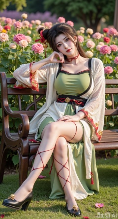 (masterpiece, best quality:1.2),A beauty ,(green|white dress). black Stockings, high heels,, paired with a sheer knitted cardigan and Mary Jane shoes. Leaning on a garden bench filled with macaron - colored flowers,.Sunlight filters through the leaves onto her face, creating a lazy and gentle atmosphere, and her skirt sways softly in the breeze. 8K resolution, detailed texture of knitted fabric, lustrous pearl texture, vivid flower colors, soft natural light, Instagram - style filter texture.,(huge breasts:2.99),(full breasts:2.99),Xfengmian2,Xzhenxianyingling,XhenrendadiX,Xzhenxianyingling2,XhenrennvdiX,XgangshouCOS,Xgangshou,XMedusaQueen