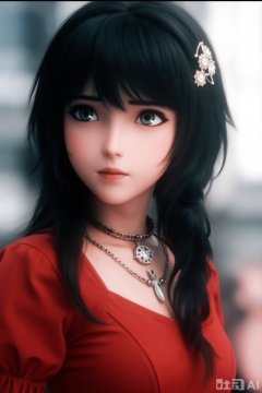 1girl, solo, long_hair, black_hair, hair_ornament, dress, jewelry, closed_mouth, upper_body, necklace, blurry, looking_to_the_side, blurry_background, expressionless, red_dress, portrait, realistic
