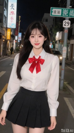 The image shows a young woman standing on a street at night. She is wearing a white blouse with a red bow tie and a black skirt. She has long dark hair and is smiling at the camera. On the right side of the image, there is a street sign with Chinese characters and numbers. The sign reads "29" and there are buildings and a car visible in the background.