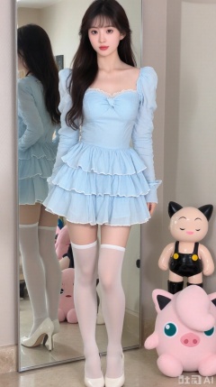 The image shows a young woman standing in front of a mirror in a dressing room. She is wearing a light blue dress with a ruffled skirt and white stockings. The dress has a sweetheart neckline and long sleeves. She has long dark hair styled in loose waves and is wearing white high heels. The woman is posing with one hand on her hip and the other resting on her thigh. There are several stuffed animals in the background, including a pink pig and a black cat.