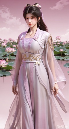 (masterpiece, best quality:1.2),1girl, navel, solo, midriff, bare shoulders, hair ornament,(long hair),(High double ponytail:1.49), red lips, BREAK, (looking at viewer:1.39), chinese clothes,(Holographic pink dress:1.36), (lace,Rainbow Gradient Color:1.28), BREAK,blurry, solo focus, long hair, lips, daytime, lipstick, outdoors, standing,upper body,(huge breasts:2.89), background, solo, makeup,(Stockings, high heels:1.29),(huge breasts:2.99),(full breasts:2.99),,(Background with lotus pond and pink lotus flowers:1.39),,Xbaozhiyinhuaqun,Xlonger,Xxiaoli,Xtangheziqun,Xyunyunshouban,XgangshouCOS,Xgangshou,XQueenMedusa,XyunxiaoYH3,XmengkeerX3,XMkeerX3