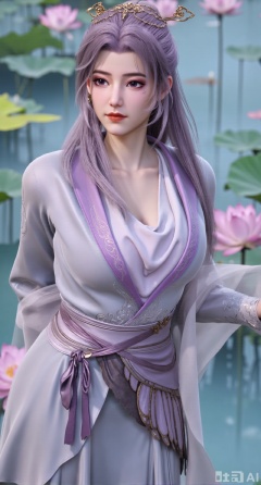 (masterpiece, best quality:1.2),1girl, navel, solo, midriff, bare shoulders, hair ornament,(long hair),(High double ponytail:1.49), red lips, BREAK, (looking at viewer:1.39), chinese clothes,(Holographic purple dress:1.36), (lace,Rainbow Gradient Color:1.28), BREAK,blurry, solo focus, long hair, lips, daytime, lipstick, outdoors, standing,upper body,(huge breasts:2.89), background, solo, makeup,(Stockings, high heels:1.29),(huge breasts:2.99),(full breasts:2.99),,(Background with lotus pond and pink lotus flowers:1.39),,Xbaozhiyinhuaqun,Xlonger,Xxiaoli,Xtangheziqun,Xyunyunshouban,XgangshouCOS,Xgangshou,XQueenMedusa,XyunxiaoYH3,XmengkeerX3,XMkeerX3