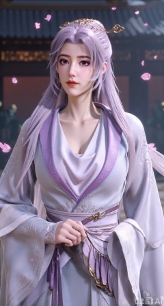 (masterpiece, best quality:1.2),1girl, solo, long hair,,(light purple long dress),, looking at viewer, hair ornament, bare shoulders, jewelry, purple eyes, long hair, flower, earrings, outdoors, parted lips, necklace, hand on hip, petals, hanfu dress, cherry blossoms, long dress, architecture, east asian architecture, falling petals,(gigantic breasts:2.99),(full breasts:2.99),Xbaozhiyinhuaqun,Xlonger,Xxiaoli,Xtangheziqun,Xyunyunshouban,XgangshouCOS,Xgangshou,XQueenMedusa,XyunxiaoYH3,XmengkeerX3,XMkeerX3