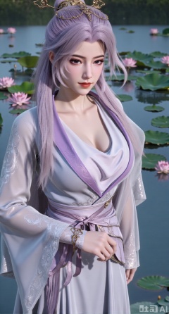(masterpiece, best quality:1.2),1girl, navel, solo, midriff, bare shoulders, hair ornament,(long hair),(High double ponytail:1.49), red lips, BREAK, (looking at viewer:1.39), chinese clothes,(Holographic purple dress:1.36), (lace,Rainbow Gradient Color:1.28), BREAK,blurry, solo focus, long hair, lips, daytime, lipstick, outdoors, standing,upper body,(huge breasts:2.89), background, solo, makeup,(Stockings, high heels:1.29),(huge breasts:2.99),(full breasts:2.99),,(Background with lotus pond and pink lotus flowers:1.39),,Xbaozhiyinhuaqun,Xlonger,Xxiaoli,Xtangheziqun,Xyunyunshouban,XgangshouCOS,Xgangshou,XQueenMedusa,XyunxiaoYH3,XmengkeerX3,XMkeerX3