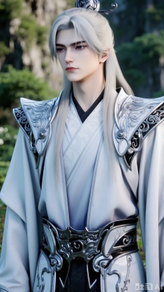 “3D anime style, handsome male character with long white hair tied up, wearing ancient Chinese style white robe with black patterns and intricate armor - like shoulder decorations, elaborate waist belt, serene and noble temperament, in a natural outdoor setting with lush greenery and soft - focused background, highly detailed, cinematic lighting,3d_character_1boy_wl