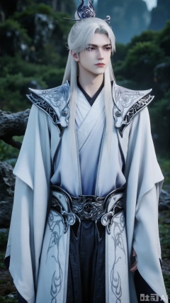 “3D anime style, handsome male character with long white hair tied up, wearing ancient Chinese style white robe with black patterns and intricate armor - like shoulder decorations, elaborate waist belt, serene and noble temperament, in a natural outdoor setting with lush greenery and soft - focused background, highly detailed, cinematic lighting,3d_character_1boy_wl