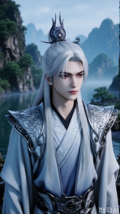 Chinese Xianxia man, long white hair + metal crown, flowing light gray robe (silk texture, silver dark patterns), detailed shoulder armor (carved designs, metallic sheen), traditional Chinese mountain - river background (mist, green peaks, like ancient scroll painting), 3D animation rendering, cinematic lighting, highly detailed, --ar 9:16 --v 6