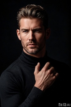 A mature and stylish man in his 30s, with a tough outline and short, stylish haircut, stands in a contemplative posture. His silhouette is against a pure black background, emphasizing his form. The composition focuses on his face, hands, and tight-fitting black turtleneck. High contrast light and shadow create a mysterious atmosphere, enhancing the texture of his clothing. The picture style is simple and high-end, with a strong sense of light and shadow, highlighting the materials and fit of his clothes. No excess decoration; the background remains pure black.xnz,omxn