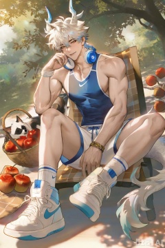 xiaozhitiao,yu xuan,multicolored hair,White dragon tail,White dragon horns,sneakers,white shorts,headphones,tattoo,yellow eyes,white hair,1boy,blonde hair,bangs,white **** top,Yishu