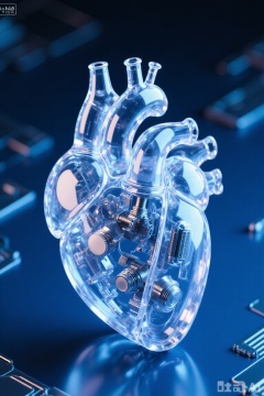 Surrealism, industrial design, product design, master composition, axis perspective, black and gray background, a fully transparent mechanical heart is placed close-up, transparently see the part structure filled with a sense of technology, with a very technological gloss, a dark blue background, ins style, C4D style