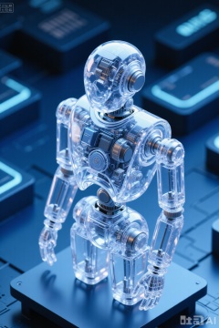 Surrealism, industrial design, product design, master composition, axis shift perspective, black and gray background, a fully transparent sweeping robot is placed close-up, transparently see the part structure filled with a sense of technology, with a very technological gloss, a dark blue background, ins style, C4D style