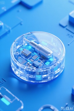超现实主义、工业设计、产品设计、大师构图、移轴视角、黑灰色背景、其上放置着一艘完全透明的卫星特写,透明以展示内部充满未来感的部件结构、高度科技光泽、深蓝色背景、ins风格、C4D风格。