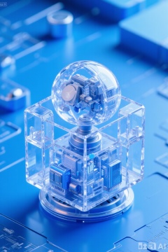 超现实主义、工业设计、产品设计、大师构图、移轴视角、黑灰色背景、其上放置着一艘完全透明的卫星特写,透明以展示内部充满未来感的部件结构、高度科技光泽、深蓝色背景、ins风格、C4D风格。
