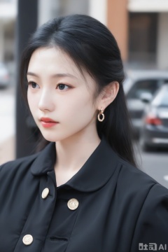 1girl, solo, shirt, black hair, jewelry, jacket, upper body, earrings, parted lips, solo focus, blurry, black eyes, lips, black jacket, looking to the side, black shirt, makeup, buttons, blurry background, lipstick, motor vehicle, realistic, red lips,
