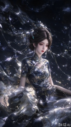This painting depicts a quiet and elegant scene, in which a young woman is wearing a cheongsam. She was lying on a textured stone with her head resting on it. Her costume design is complex, featuring exquisite embroidery and light and elegant black fabrics. Her hair is combed into a delicate ball head, and gorgeous Hairpin is used to increase the overall elegance and exquisiteness. The background is soft and fuzzy, and the dreamy black background enhances the quiet atmosphere of the scene.