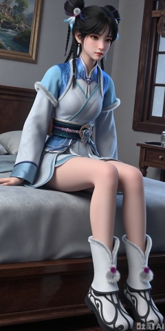 1girl, solo, long hair, looking at viewer, closed mouth, black hair, yellow eyes, full-body,Perfectly proportioned,ray tracing,shiny_skin,oil,Show your long legs,(Sitting:1.5),Beautiful thighs, show the thighs,LiMuWan,jiu,Interior, bed, painting, table, window,yws,YfeetY,1girl, solo, double bun, jewelry, earrings, black hair,hair ornament, braid, chinese clothes,realistic, pom pom (clothes),black eyes, fur trim, long sleeves, wide sleeves,dress, brown eyes, bangs, tassel, hair flower,sash,full body,thighhighs,shoes,legs,toeless footwear,NingXiaoLing,white and blue winter boots with black patterns. The boots have a furry white trim with a small blue pom-pom on each side. The boots are slightly open at the top, revealing white socks with blue and purple stripes near the top.